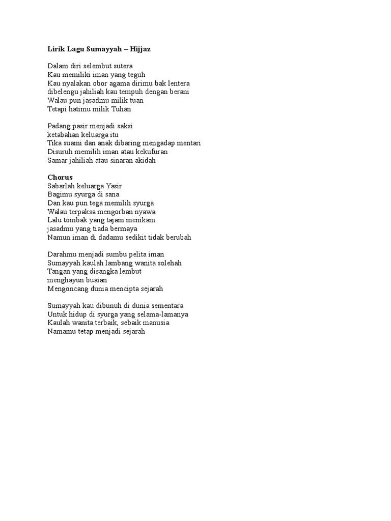 Sumayyah Lyrics Hijjaz. Dibelengu jahiliah kau tempuh dengan berani. Dalam diri selembut sutera Kau memiliki iman yang teguh Kau nyalakan obor agama dirimu bak lentera Dibelengu jahiliah kau tempuh dengan.